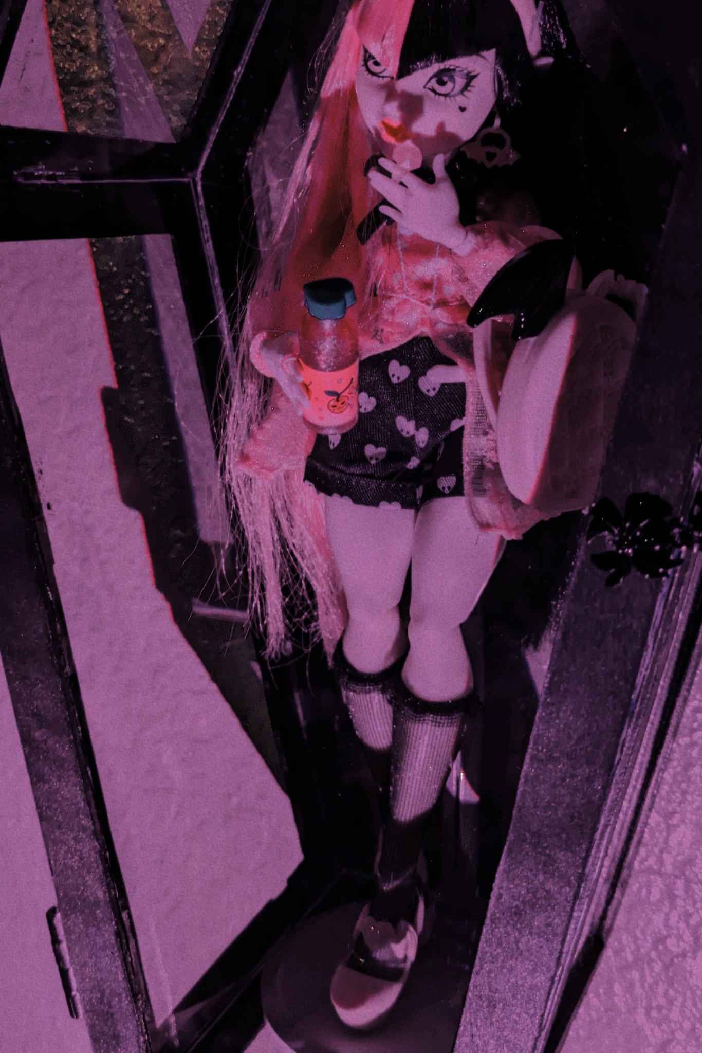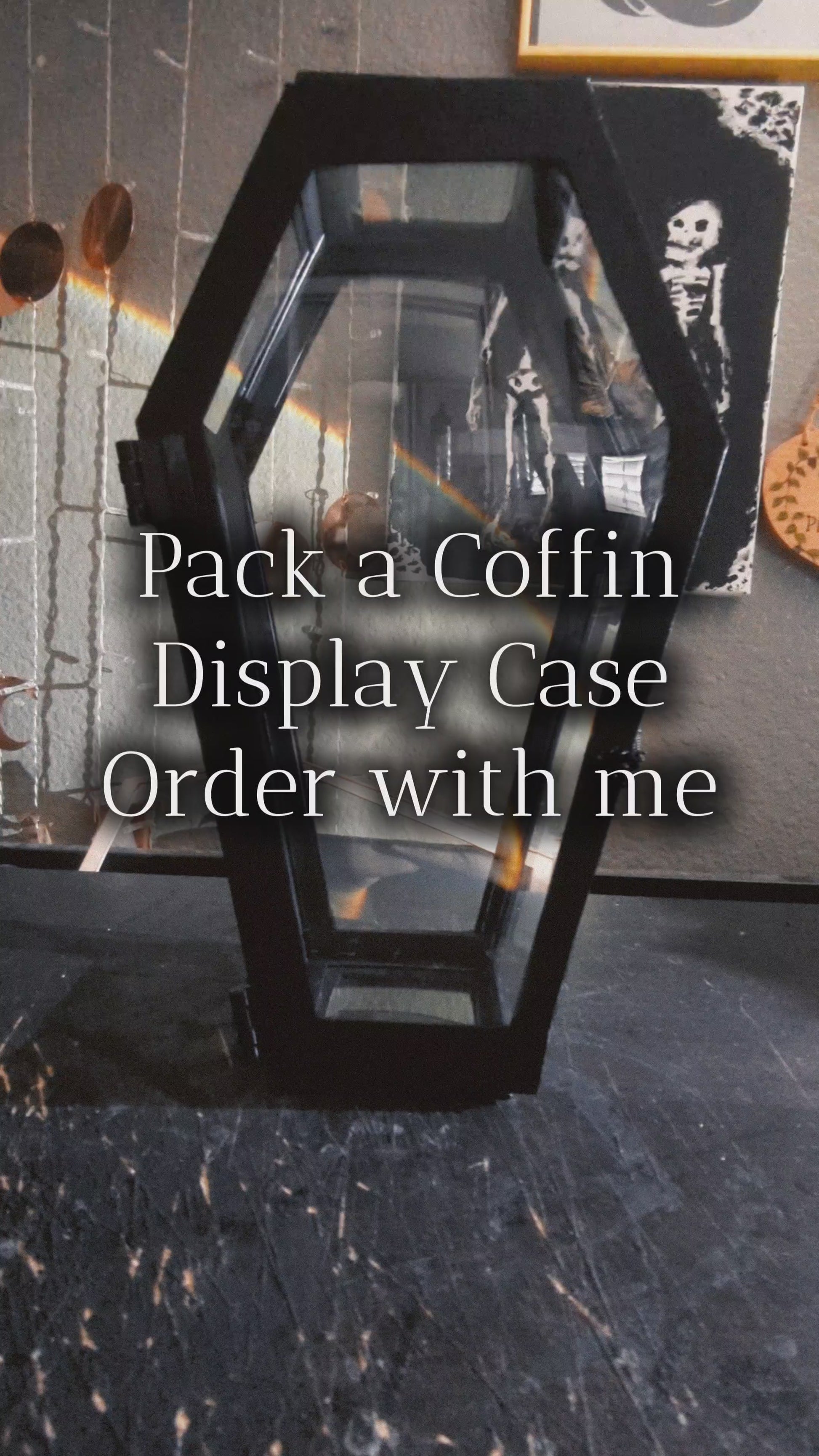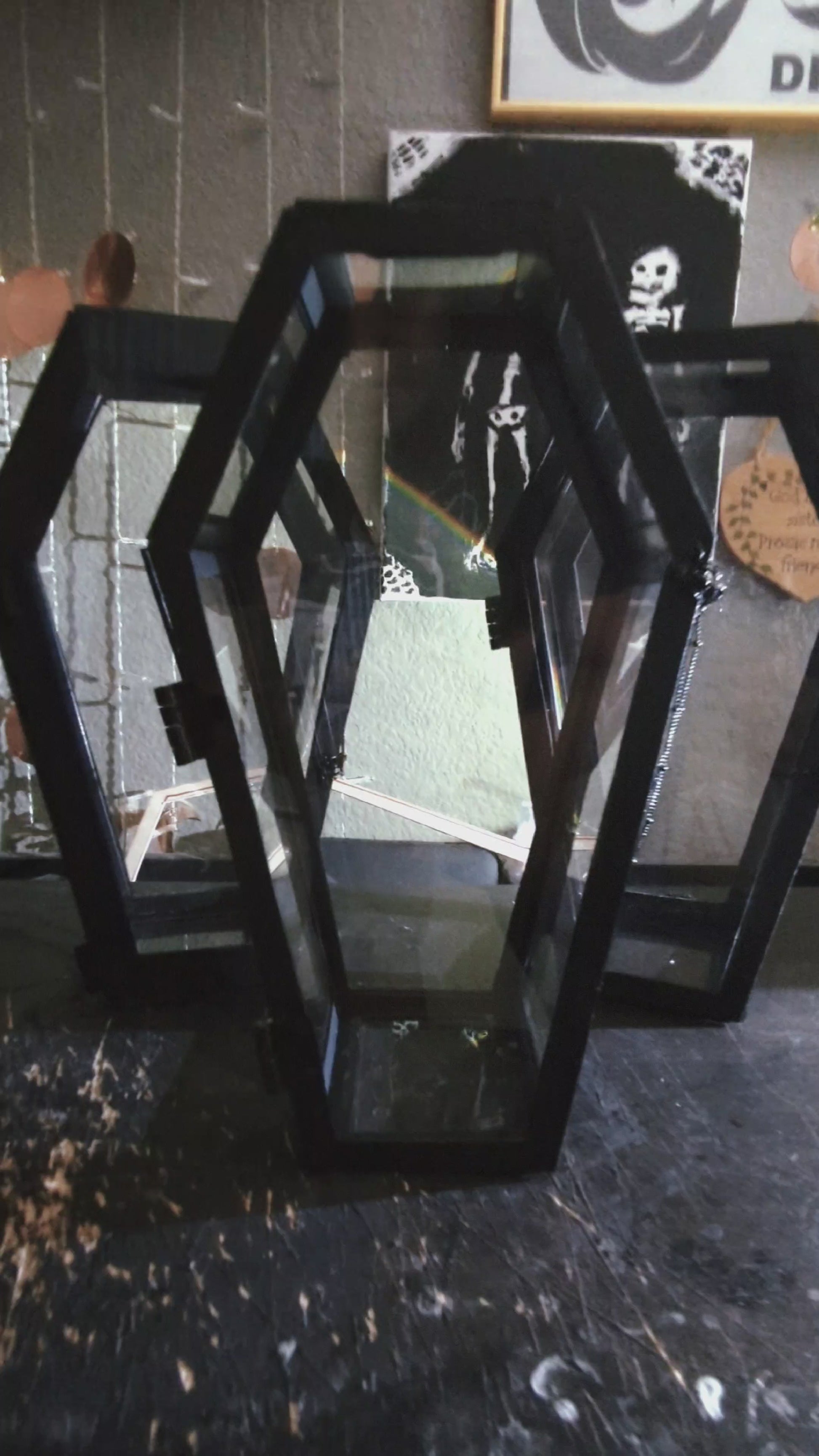 Have a doll, bouquet, or other various items you've always wanted to display in a ghoulishly creepy case? Well, look no further! This coffin display case is 12 in tall, 4.5-6 in wide, and 4 in deep measured to hold a monster high doll (if we're being honest); but is capable of holding any item within that measurement or 1lb or lighter. With a spider chain enclosure, you'll rest easy knowing your precious items are secured in it's plexiglass tomb. Compliment your spooky decor with this perfectly grotesque display case.